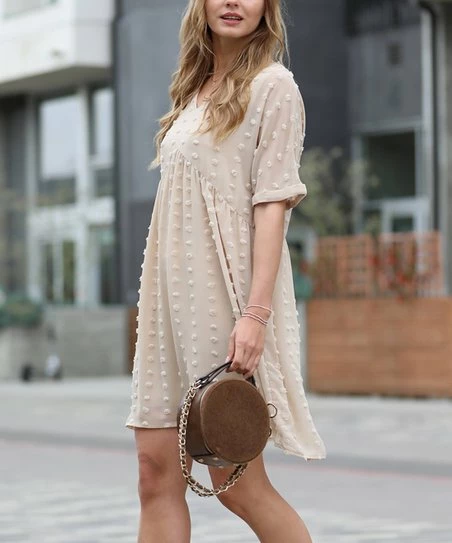 Add sweet fashion to your closet with this babydoll dress featuring chic Swiss dots and a single hue.