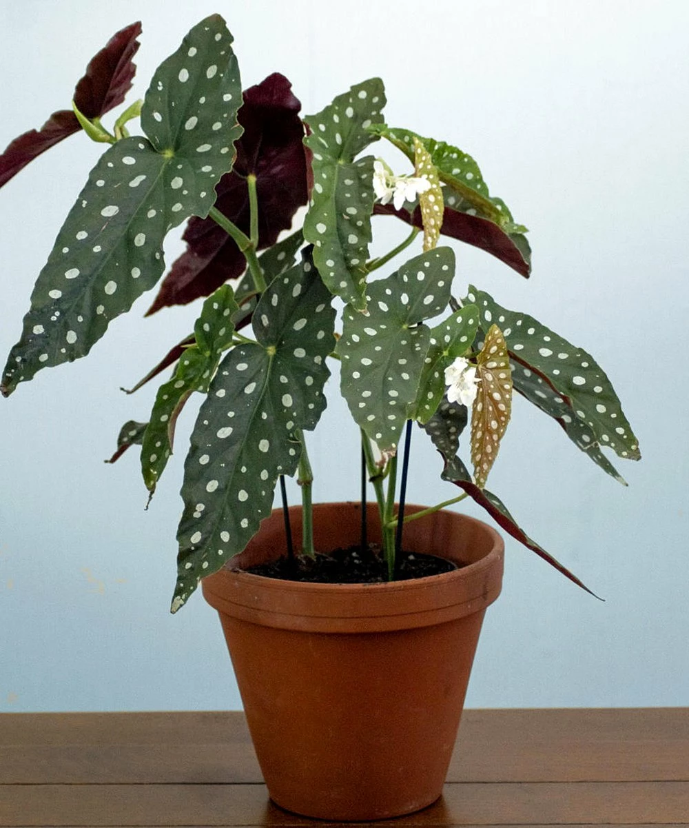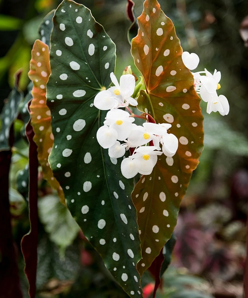 Every season is show season for βPolka Dotβ! Silvery dots decorate the upper sides of its olive-green, heart-shaped leaves while the reverse side boasts an eye-catching red-Bordeaux color. From late winter to early spring, it produces clusters of large white flowers held on a single flower stem. This exotic houseplant will amaze everyone with its unique appearance!