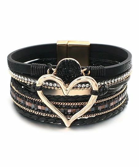 Versatile layered bracelet crafted with black faux leather and goldtone chains. Glass crystals add a sparkly touch.