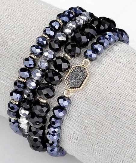 - Includes one black beaded bracelet, one purple beaded bracelet, one silvertone beaded bracelet and one purple beaded bracelet with a sparkling imiation-stone detail (four pieces total)