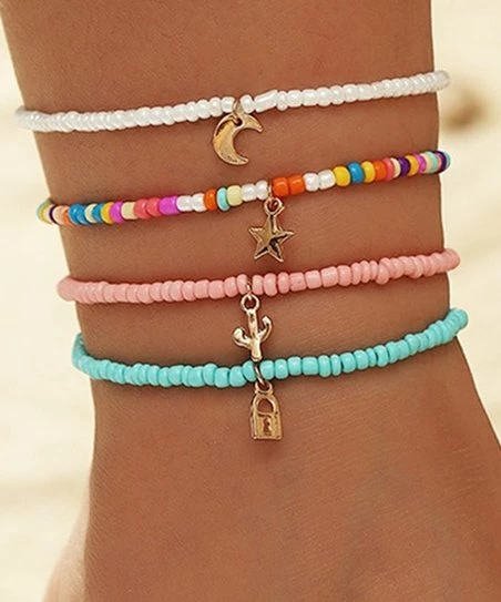 - Includes pink stretch anklet, blue stretch anklet, white stretch anklet and multicolor stretch anklet (four pieces total)