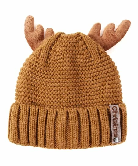 Cozy beanie with a ribbed cuff and attached antlers for festive charm.