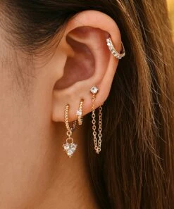 - Includes one pair of goldtone huggie earrings, one pair of crystal and goldtone textured huggie earrings, one pair of channel crystal and goldtone huggie earrings, one pair of crystal and goldtone textured dangle huggie earrings and one pair of crystal and goldtone chain stud earrings (five pairs total)