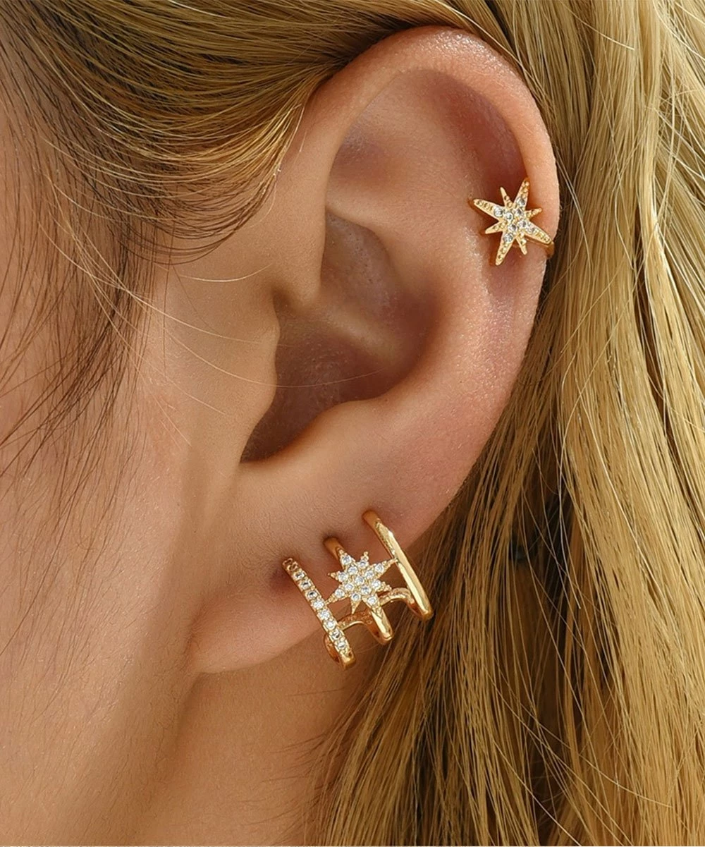 - Includes a pair of crystal and goldtone curled star stud earrings and a crystal and goldtone star ear cuff (two pieces total)