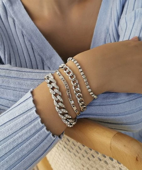 - Includes four different silvertone chain bracelets