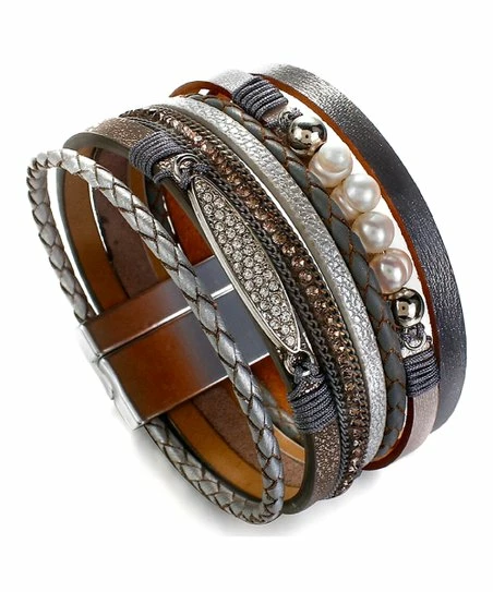 Add an edgy style to your jewelry collection with this metallic faux leather bracelet adorned with freshwater pearl and sparkling crystal.