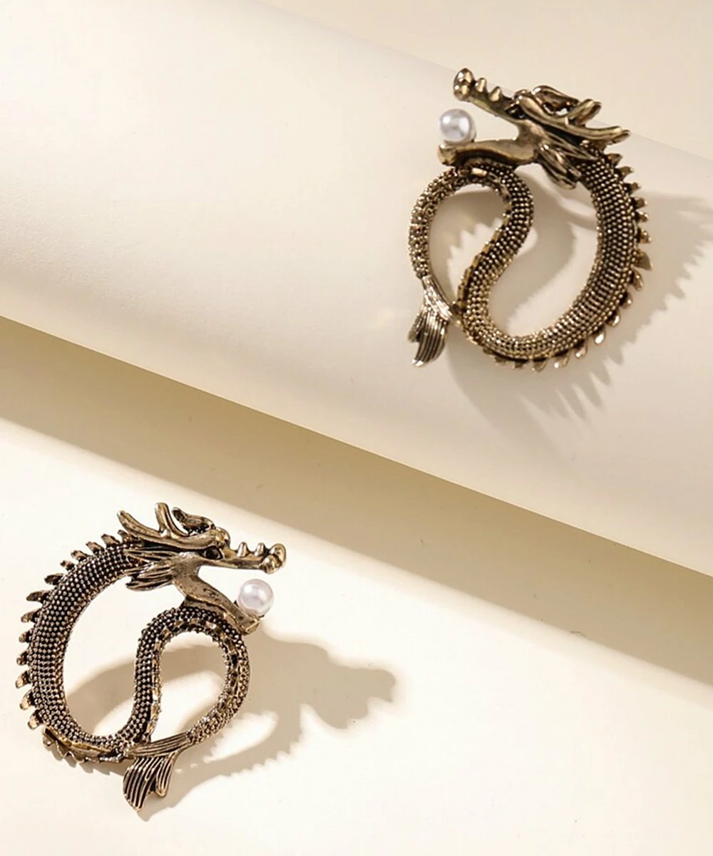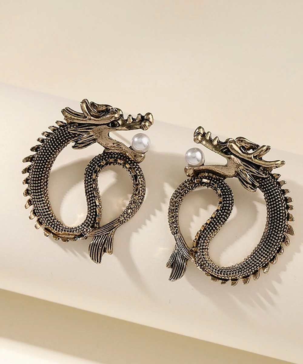 Add bold, whimsical accessorizing with this pair of dragon drop earrings featuring an imitation pearl in mouth.