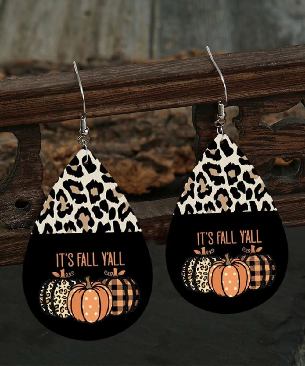 Fun teardrop earrings featuring pumpkin and leopard patterns over faux leather frames.