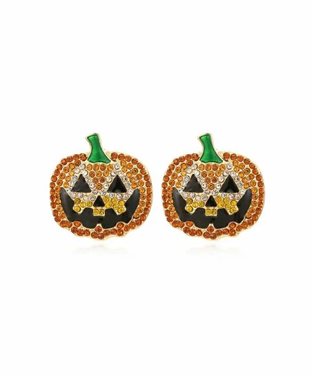 Jack-o-lantern stud earrings featuring pavΓ© crystal and colorful resin over a goldtone finish.