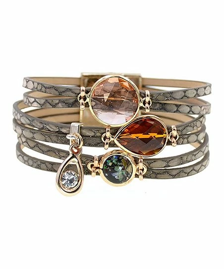 Lend an eclectic touch to any ensemble with this wrap bracelet fashioned from several strands of faux leather boasting multicolor crystals in various shapes for extra charm.