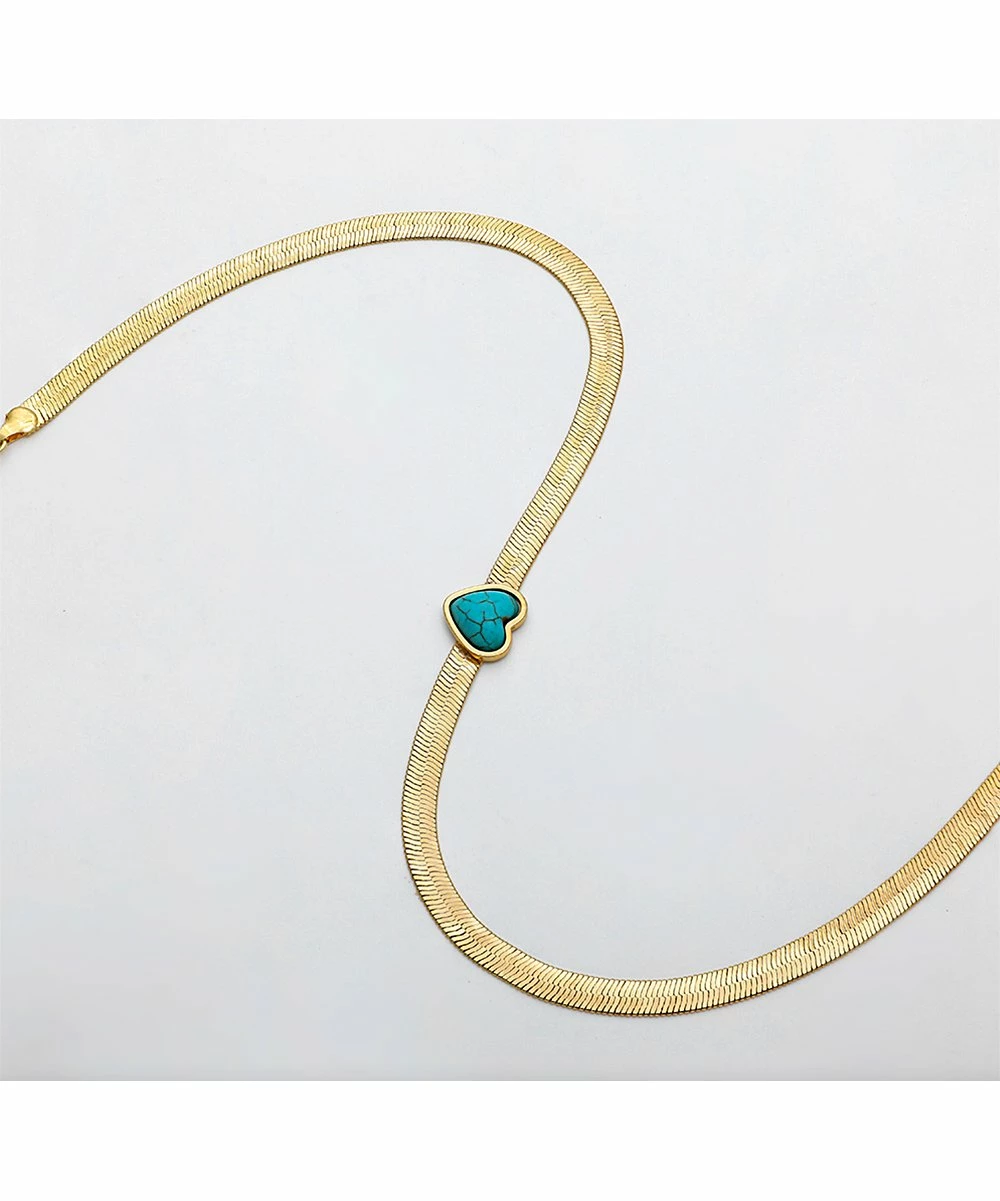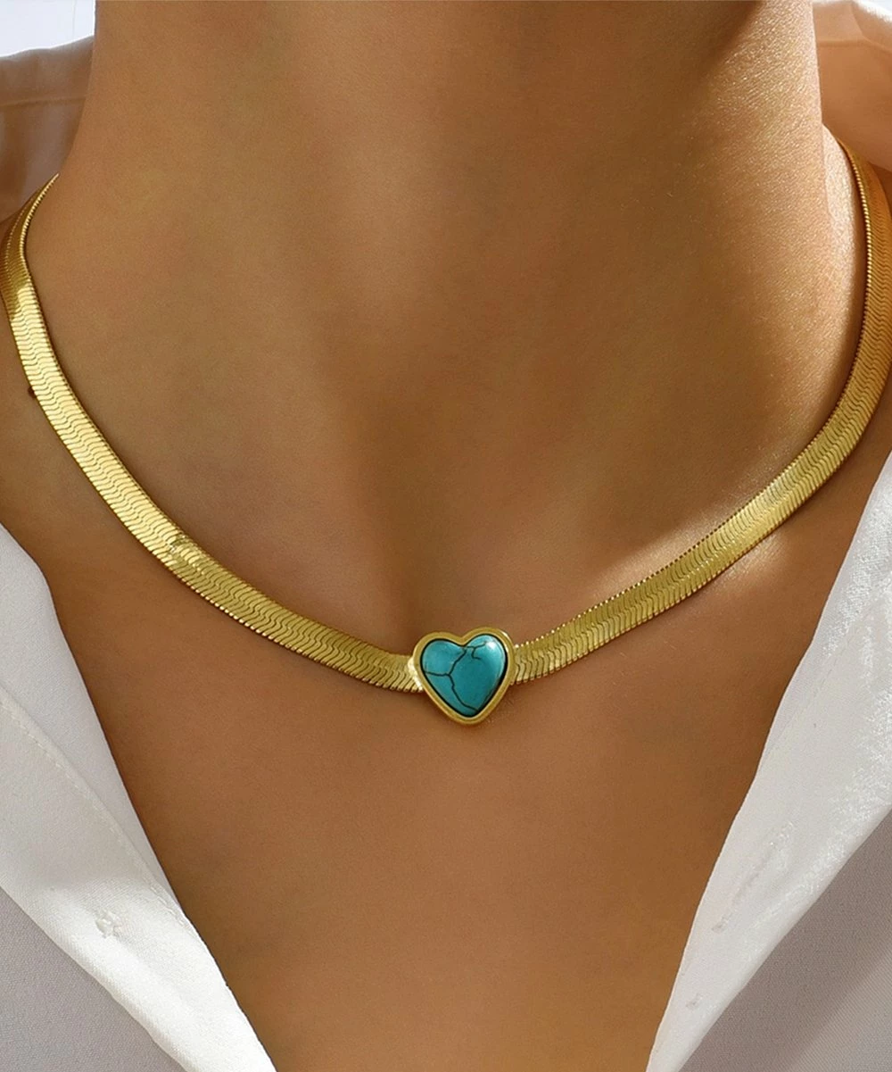 This necklace features a cool-hued heart centerpiece and a lustrous metal chain.