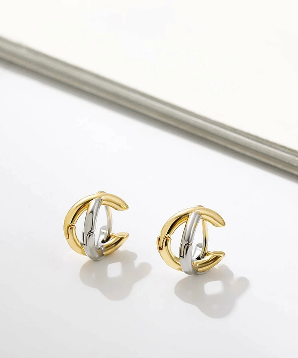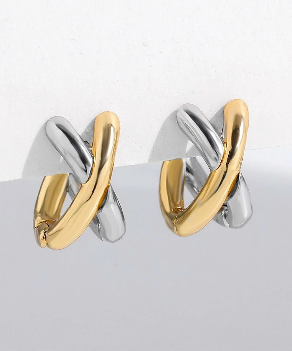 Goldtone and silvertone huggie earrings with a unique crisscross design.